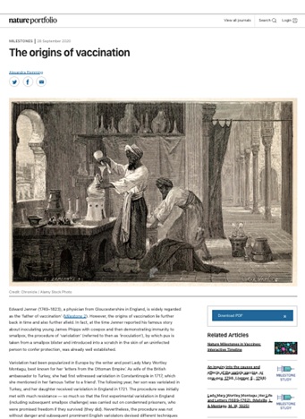 Caption: Alexandra Flemming’s briefing on vaccination’s origins outside of Europe, nature portfolio (2020)Flemming recapitulates the modern history of inoculation and its origins which either lie in the islamic world or were mediated by it: