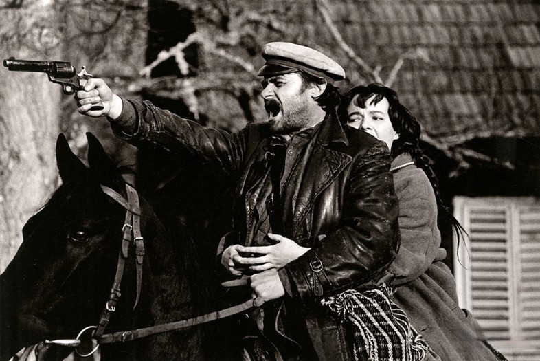 Ivi Gregureviću pak puno bolje pristaje uloga slavonskoga delije – simpatična mangupa koji griješi kako bi drugima pomogao, od uloge kicoša koji ne uspijevati sviti gnijezdo s visprenom, ali nedostižnom Svilenom, opterećenom revolucijom i Lenjinom. Ena Begović snažno je utjelovila fatalnu ženu i indoktriniranu ljepoticu sklonu fetišima – Čarugi naime ne dopušta vođenje ljubavi bez čizama. S njezinom pojavom zapravo i počinje Čarugin pad – do samoga kraja, on harambaša vjerovao je da može biti dio Svilenina svijeta. Njegov ego u ravnoteži pak drži jedna druga pojava: lukavi žandar Gile kojemu je misija uhititi Čarugu za kojim je u međuvremenu raspisana i tjeralica. No, Čarugino odmetništvo nije tek donkihotovska osveta buržujsko-kapitalističkom društvu, nego i težnja onoga koji je obilježen egzistencijalnom negativnošću da se uzdigne nad životnim bezdanom i besperspektivnošću.